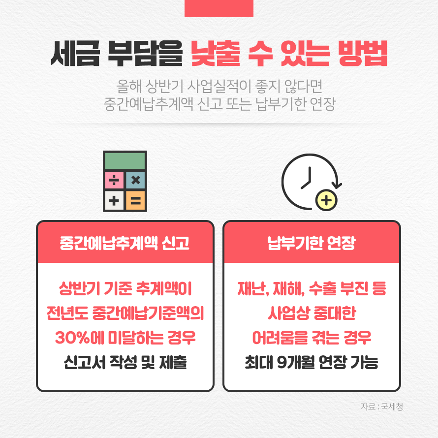 중간예납세액은 납세고지서에 따라 내는 것이 원칙입니다. 하지만 중간예납세액이 전년도를 기준으로 하기 때문에, 상반기 사업 실적이 좋지 않았다면 부담이 될 수 있습니다. 이 납세자 스스로 올해 기준으로 계산한 중간예납추계액을 신고 및 납부하거나, 납부기한을 연장해 세금 부담을 낮출 수 있습니다.