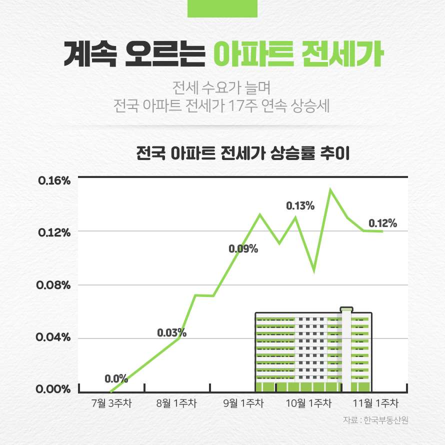 한국부동산원에 따르면, 전국 아파트 전세가는 17주 연속 상승세입니다. 2023년 7월 24일 전세 상승률 0.01%를 기록한 이후 꾸준히 상승하며 2023년 11월 13일에는 상승률 0.11%를 기록했습니다.