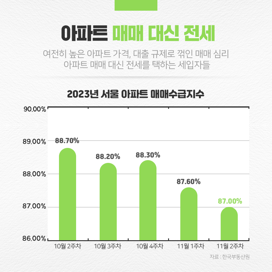 여전히 높은 아파트 가격과 대출 규제로 인해 아파트 매매 대신 전세를 택하는 세입자들도 있습니다. 2023년 9월 27일부로 특례 보금자리론 일반형 판매가 중단되고, 초장기 대출 길 역시 막힌 상황에서 무리하게 고금리 대출을 받아 집을 구매하기보다는 전세를 살며 때를 보겠다는 것입니다.