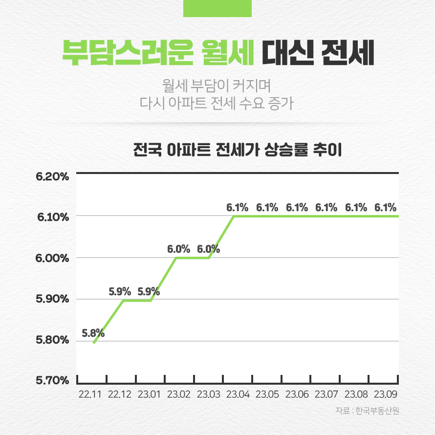 한동안 대안으로 떠올랐던 월세의 인기도 가라앉으며 전세의 수요는 크게 증가하고 있습니다. 전세 사기가 걱정된 사람들이 몰리며 월세가 크게 오르자 부담을 느낀 세입자들이 다시 아파트 전세로 눈을 돌리고 있는 것입니다. 실제로 한국부동산원 월간 주택 가격 동향에 따르면 2023년 3월 이후 0.03% 상승 전환을 한 이후, 전국 연립·다세대주택의 월세 가격지수는 꾸준히 상승세를 이어가고 있습니다.