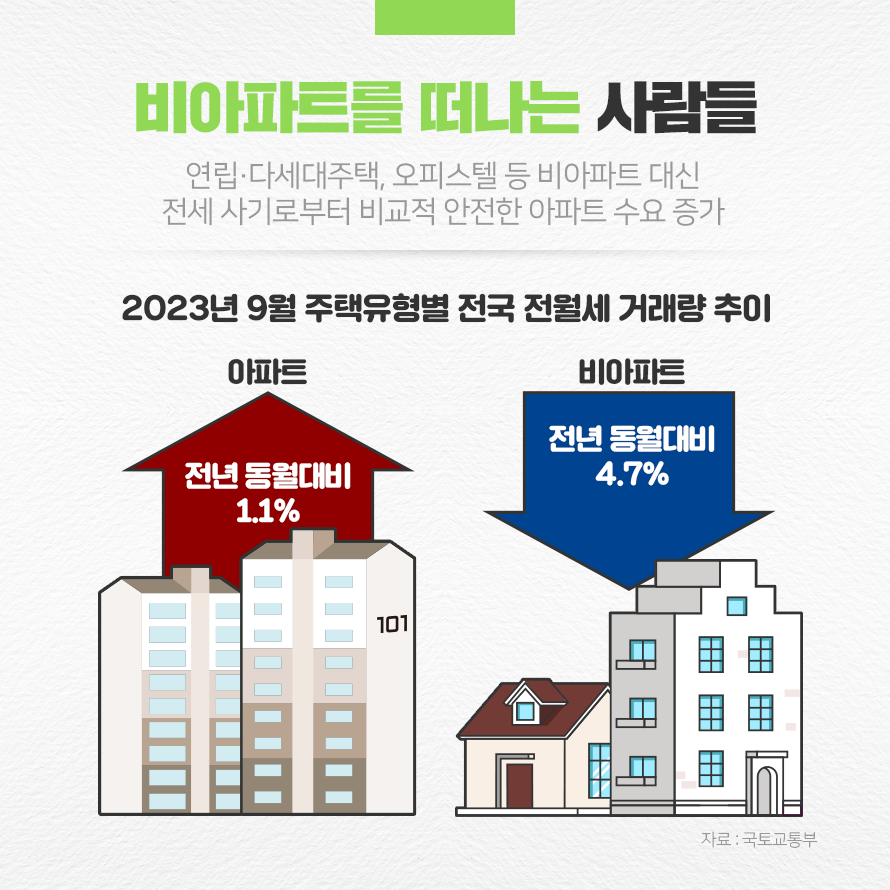 실제로 국토교통부가 발표한 '2023년 9월 주택 통계'에 따르면, 전국 아파트 전월세 거래량은 전년 동월 대비 1.1% 증가한 반면, 전국 비아파트 전월세 거래량은 전년 동월 대비 4.7% 감소했습니다. 또한 서울부동산정보광장 통계에 따르면 2023년 10월 서울 연립·다세대주택의 전월세 거래량은 8,629건으로 2020년 11월(8,381건) 이후 2년 11개월 만에 가장 낮은 수치를 보였습니다.