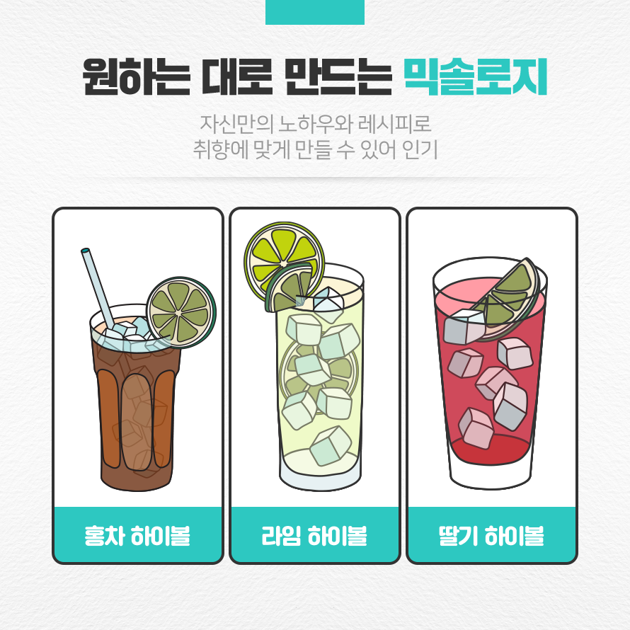 하이볼의 인기 요인 중 하나는 ‘믹솔로지’ 매력 때문입니다. 믹솔로지(Mixology)는 ‘Mix(섞다)’와 ‘Technology(기술)’이 결합한 신조어로 다양한 종류의 술과 음료를 섞어 만드는 기술을 말합니다. SNS에는 집에서 쉽게 하이볼을 만드는 노하우와 다양한 레시피가 있어 누구나 쉽게 따라 만들 수 있는데요. 탄산음료를 넣어 달게 만들거나, 홍차 등 다른 재료를 더해 자신의 취향에 따라 만들 수 있습니다. 이러한 점은 자신의 취향에 맞는 소비를 지향하는 20, 30세대에게 큰 매력으로 다가오며 새로운 주류 문화를 이끌었습니다.
