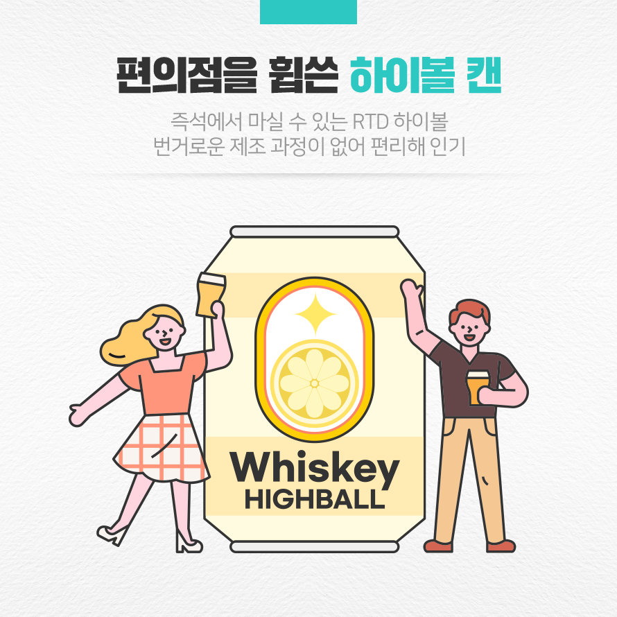 하이볼의 인기가 높아지면서 편의점을 중심으로 즉석에서 마실 수 있는 ‘RTD(Ready to Drink)’ 하이볼도 등장했습니다. 편의점 RTD(Ready to Drink) 하이볼 제품은 번거로운 제조 과정 없이 바로 마실 수 있어 편리하다는 장점이 있습니다. 또한 색다른 향을 내기 위해 레몬, 자몽 등 재료를 첨가하거나, 위스키 대신 고량주나 소주 등 다른 술을 넣는 등 다양한 소비자 취향에 맞는 제품을 구매할 수 있어 인기를 끌고 있습니다.