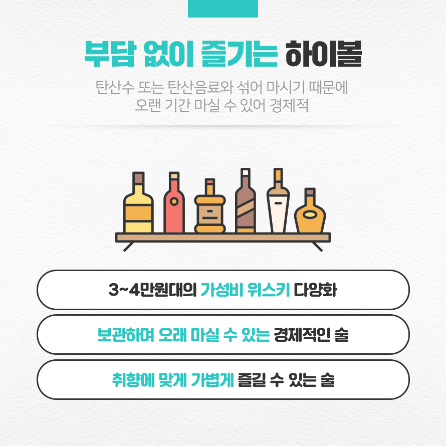 하이볼에 대한 인기가 높아지며, 3~4만 원대의 가성비 있는 위스키 선택지도 많아졌습니다. 탄산수 등과 섞어 마시기 때문에 향이 강하고 비싼 제품이 아니더라도 하이볼을 즐기는 데 어려움이 없습니다. 설사 그 이상의 가격이더라도 탄산수 등과 섞어 마시는 만큼 오랜 기간 마실 수 있다 보니 젊은 소비자들에게 하이볼은 경제적인 술로 인식되고 있습니다.