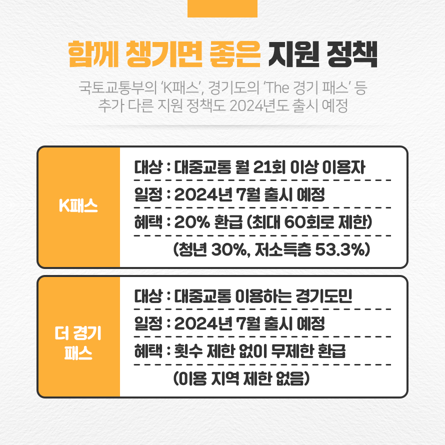서울시에서 내놓은 ‘기후교통카드’ 외에도 다른 지원 정책들도 있습니다. 국토교통부의 ‘K패스’, 경기도의 ‘The 경기 패스’도 있으니 본인에게 해당하는 정책을 적극적으로 활용해 보시기 바랍니다.