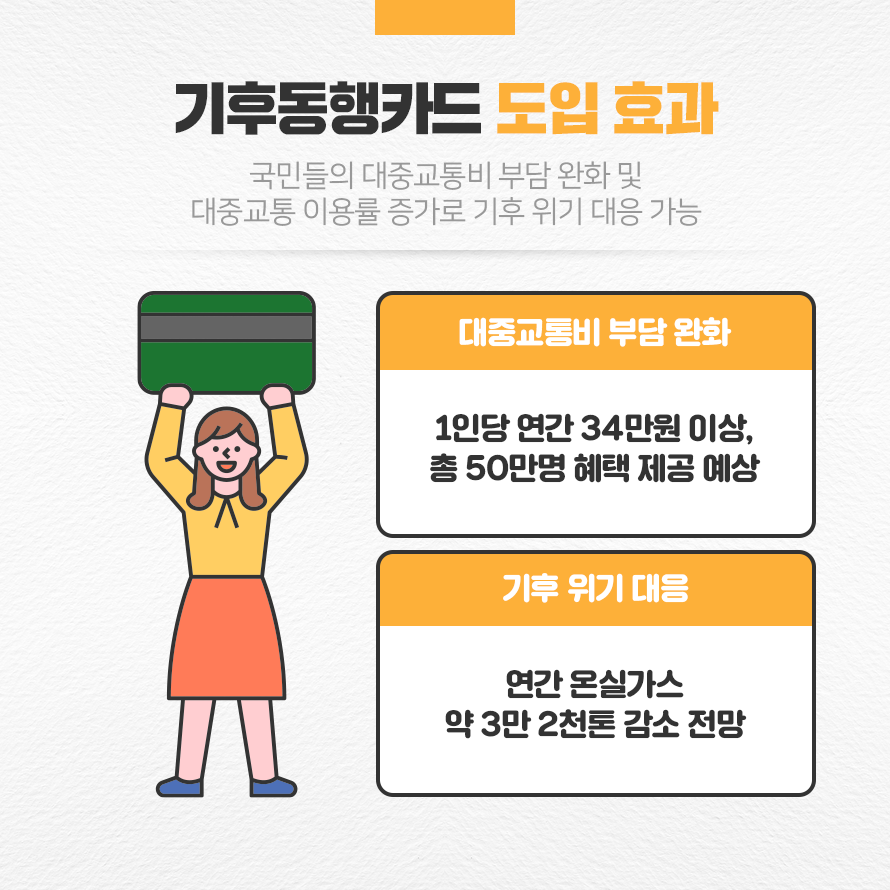 기후동행카드의 출시로 대중교통 이용률을 높여 범세계적인 기후 위기에 대응하면서도, 교통 요금 인상으로 인한 가계 부담을 낮추기까지 하는 일석이조의 효과가 기대되고 있습니다. 출퇴근 등 대중교통을 자주 이용한다면, 출시 일정과 혜택을 확인하셔서 교통비 부담을 줄이는 데 활용하시기 바랍니다.
