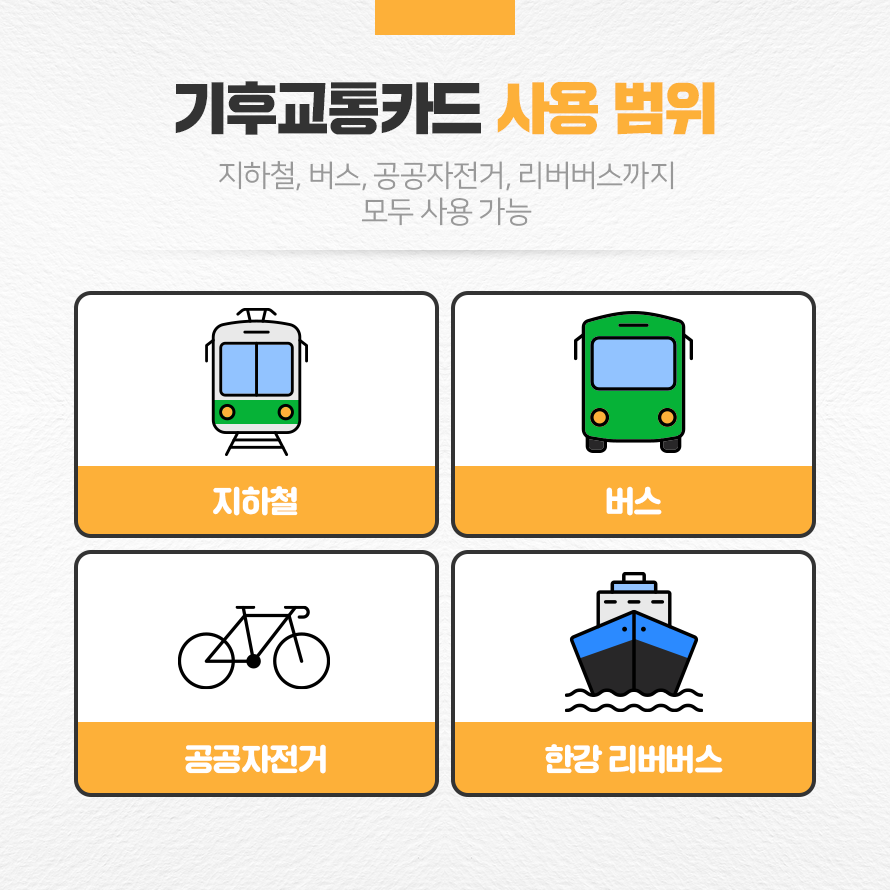 기후동행카드의 출시로 대중교통 이용률을 높여 범세계적인 기후 위기에 대응하면서도, 교통 요금 인상으로 인한 가계 부담을 낮추기까지 하는 일석이조의 효과가 기대되고 있습니다. 출퇴근 등 대중교통을 자주 이용한다면, 출시 일정과 혜택을 확인하셔서 교통비 부담을 줄이는 데 활용하시기 바랍니다.