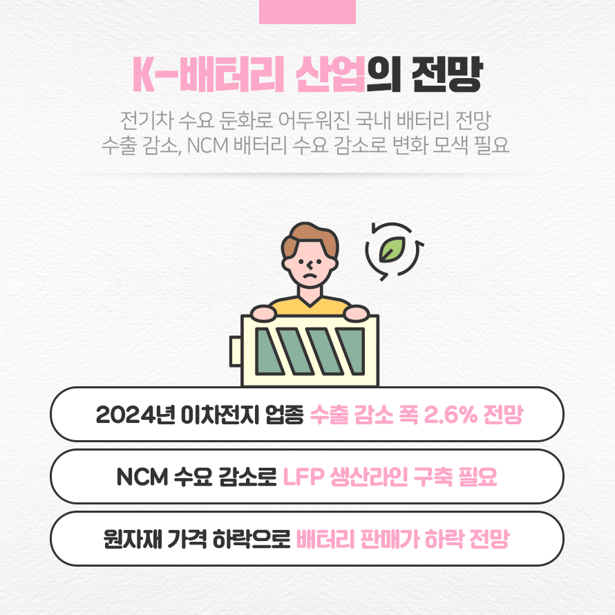 전기차 수요 둔화로 인해 주요 전기차 업체는 기존 NCM(니켈, 코발트, 망간) 배터리 대신 안정성이 높고 가성비가 높은 LFP(리튬, 철, 인산) 배터리를 채택하고 있습니다. 이에 NCM 양산에 집중하던 국내 이차전지 업계는 긴장감이 맴돌고 있습니다. 수익성 악화로도 이어질 수 있는 중요한 문제인 만큼 주요 이차전지 기업에서는 변화에 대응하기 위한 돌파구를 찾고 있습니다.