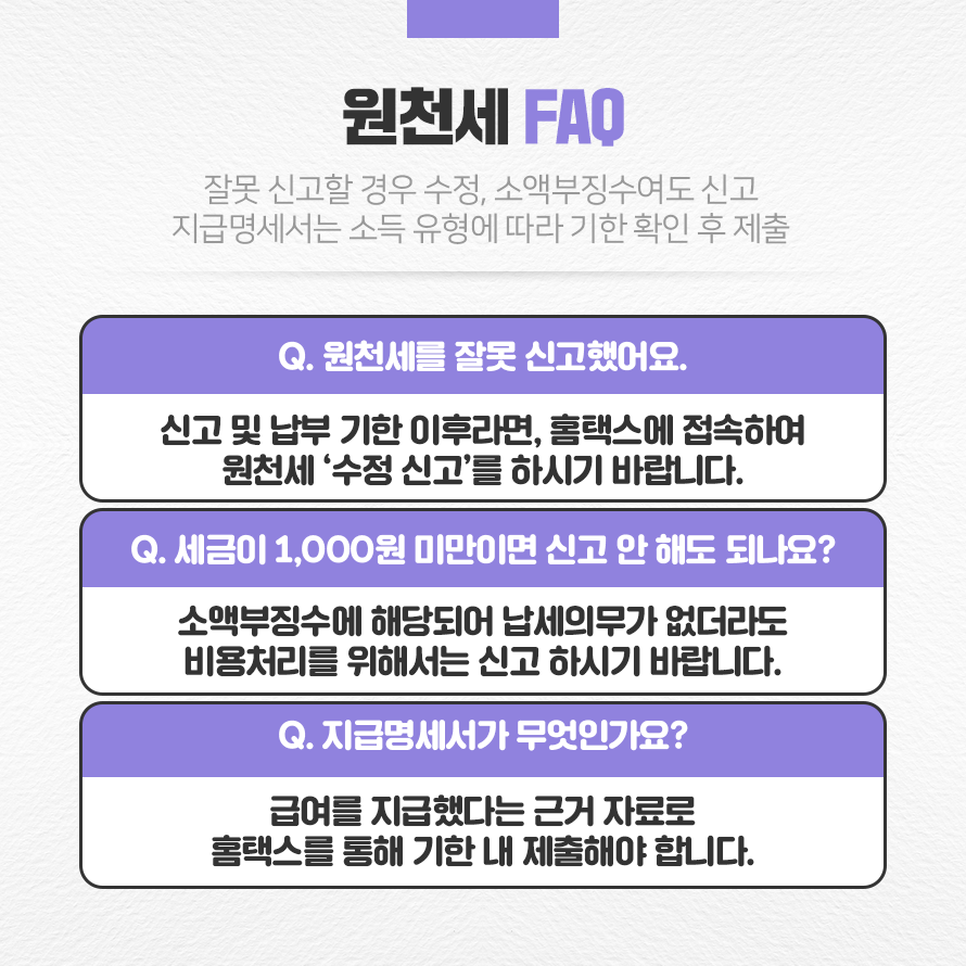 사업을 시작하게 되면 챙겨야 하는 세금이 참 많은데요. 특히 원천세는 원칙적으로 매달 챙겨야 하는 세금인 만큼 꼭 잊지 말고 기한 내 납부하시기를 바랍니다. 원천세 신고 및 납부 방법에 대한 내용을 꼼꼼하게 숙지하고, 납세자의 의무를 다하시기 바랍니다.