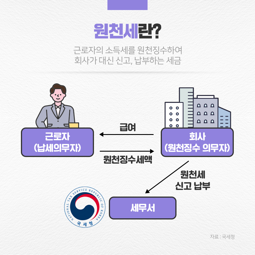 원천세란, 근로자의 소득세를 회사가 대신 신고, 납부하는 세금입니다. 국가가 수많은 근로자에게 직접 세금을 걷는 것은 효율적이지 않은 데다가 근로자가 소득을 거짓 신고를 할 우려도 있다 보니 급여를 지급하는 회사가 대신 납부하도록 한 것입니다. 따라서 고용주(회사)는 급여를 지급하기 전에 ‘소득세’를 미리 떼어내고 차액을 근로자에게 지급하며 미리 떼어낸 세금, 즉 원천징수 한 세금은 잘 정리해서 근로자를 대신해 신고하고 납부하게 됩니다.