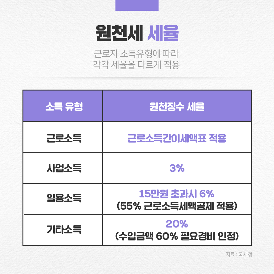 원천세 세율은 ‘근로자의 소득 유형’에 따라 다르게 적용됩니다. 소득 유형은 고용 관계에 따라 크게 근로소득, 사업소득, 일용소득, 기타소득 4가지로 나눌 수 있습니다.