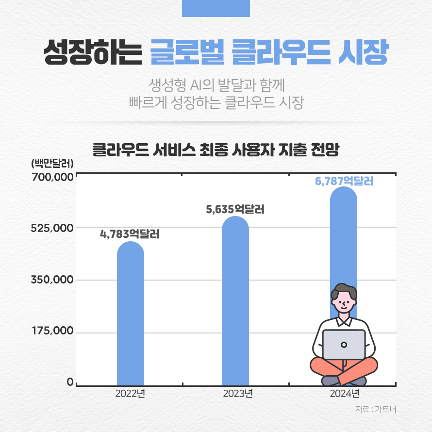 기업들이 클라우드에 보이는 관심과 수요가 급증하면서 클라우드 시장은 나날이 성장하고 있습니다. 글로벌 시장조사기관에 따르면 2024년 전 세계 퍼블릭 클라우드 서비스에 대한 최종 사용자 지출액은 6,788억달러(약 902조 1,252억원)에 달할 것으로 예측했습니다. 이는 2023년 전망치보다 20.4% 증가한 수치로, 전년보다 클라우드 시장 모든 부문의 지출이 증가할 것으로 보입니다. 또한 2027년까지 70% 이상의 기업들이 산업 클라우드 플랫폼을 사용하여 더욱 빠르게 비즈니스 혁신을 이뤄낼 것이라는 전망이 나옵니다.