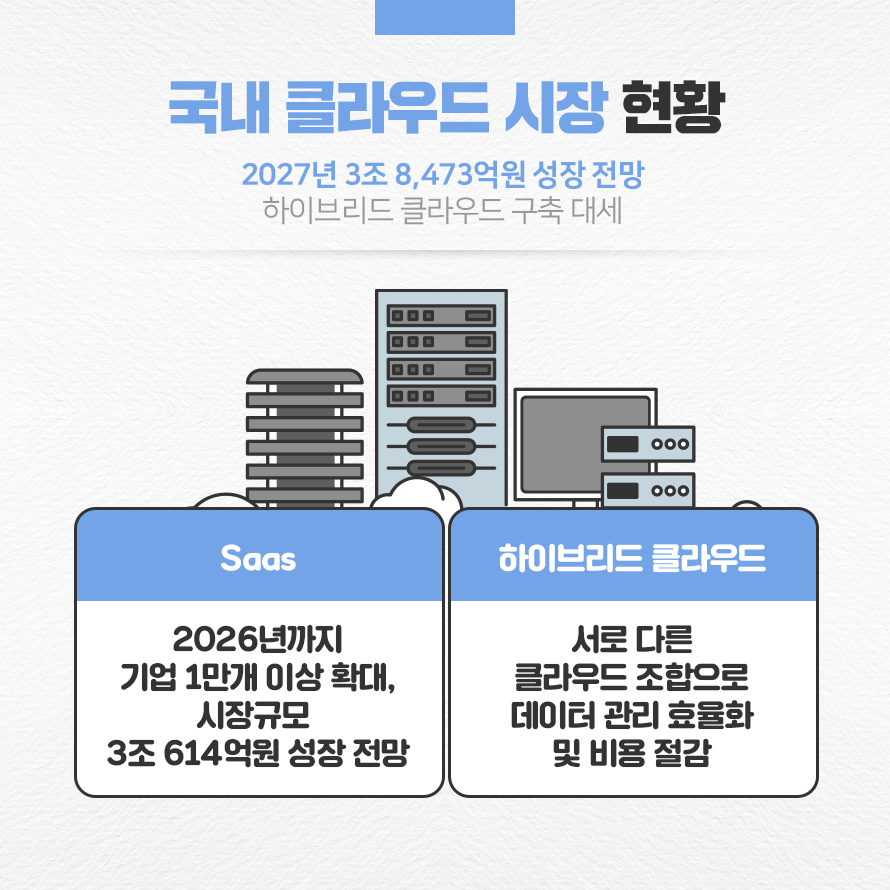 글로벌 클라우드 시장이 빠르게 성장하고 있는 데 가운데 국내 클라우드 시장의 전망 역시 밝습니다. 한 시장분석기관에 따르면 국내 클라우드 인프라 시장은 2023년 2조 7,027억원에서 연평균 8.8% 성장하여 2027년 3조 8,473억원 규모까지 확대될 것으로 전망됩니다.