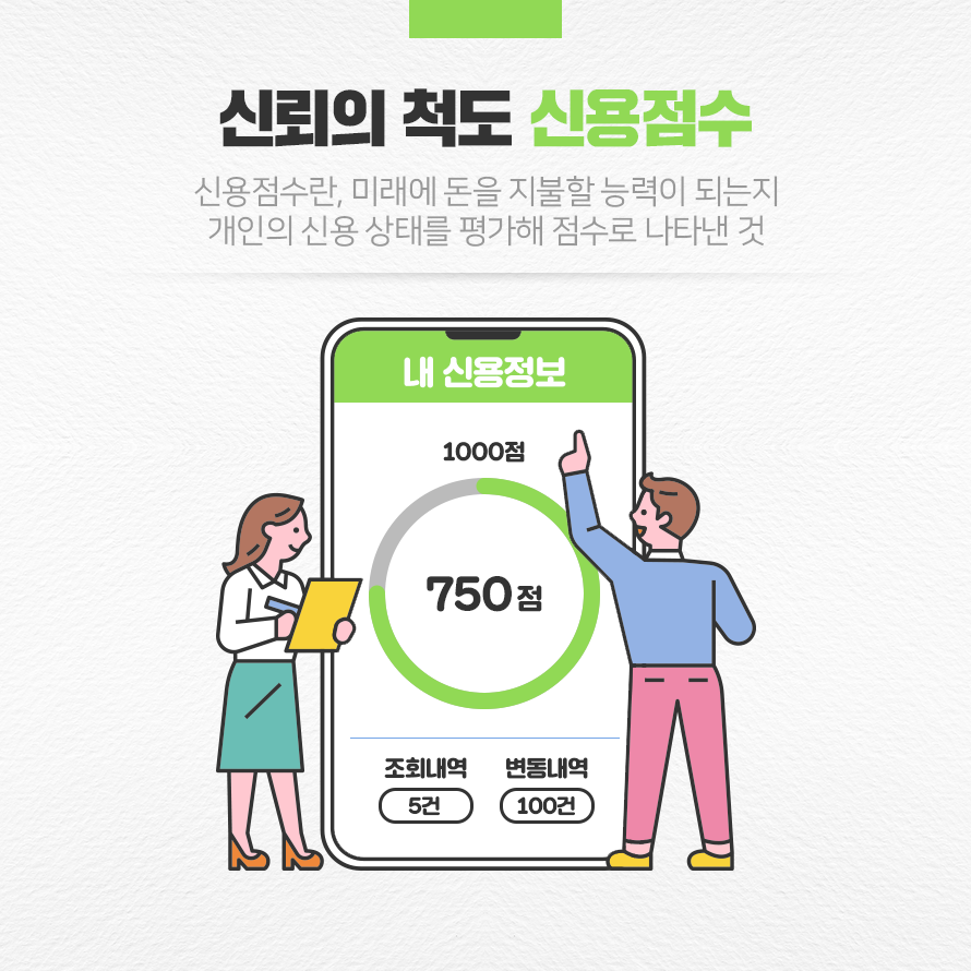 더 나은 금융 생활을 위하여 신용점수를 꾸준히 관리하는 것이 필요합니다. 혹여 대출을 이용하는 등 신용점수가 필요한 순간에 보다 좋은 조건으로 금융 서비스를 이용하실 수 있도록 평소에 신용점수에 관심을 갖고 관리해나가시길 바랍니다.