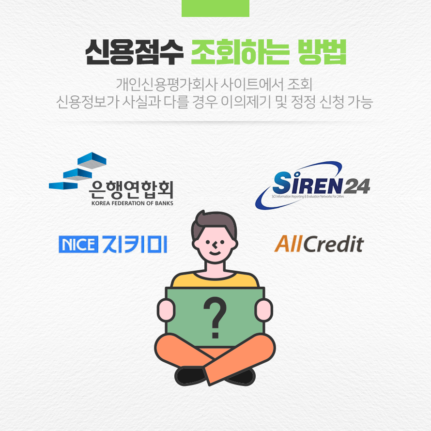 신용점수를 관리하기 위한 첫 걸음은 자신의 신용점수를 아는 것입니다. 앞서 소개한 개인신용평가회사 사이트인 또는 서울신용평가정보에서 운영하는 ‘사이렌24’ 홈페이지에 접속하면 신용점수를 조회하실 수 있습니다.