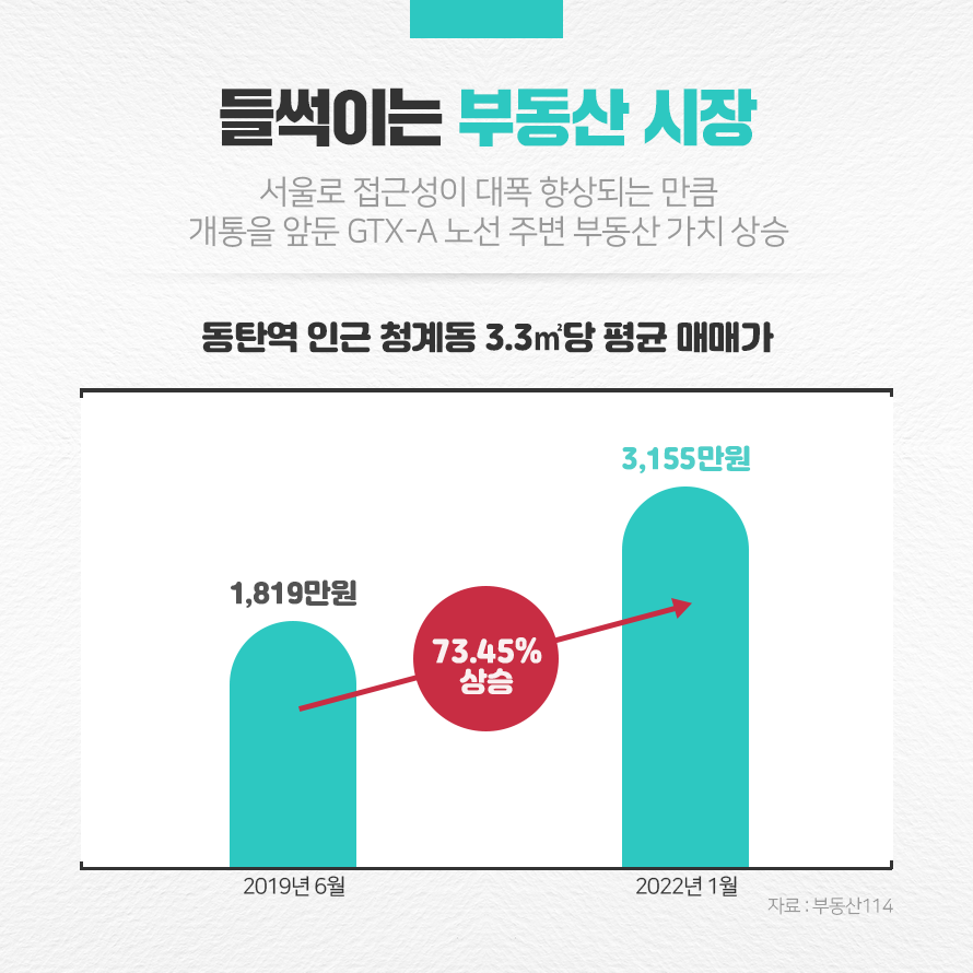 특히 개통까지 1년이 남지 않은 GTX-A 노선 주변 지역 집값 상승이 두드러지고 있습니다. 예를 들어, GTX-A 노선이 들어서는 동탄역 인근 청계동의 3.3㎡당 평균 매매가는 2019년 6월 1,819만원이었습니다. 이후 평균 매매가는 2022년 1월까지 3,155만원을 기록하며, 19개월간 73.45%의 상승률을 보였습니다. GTX-A노선 착공 전인 2017년 12월부터 2019년 6월까지 평균 매매가가 1,562만원에서 1,819만원으로 16.45% 상승한 것과 비교했을 때 4배 이상 차이입니다. 개통이 임박한 데다가 처음 개통되는 노선이다 보니 당분간 GTX-A노선 주변 지역의 부동산 가격은 강세를 보일 것으로 보입니다.