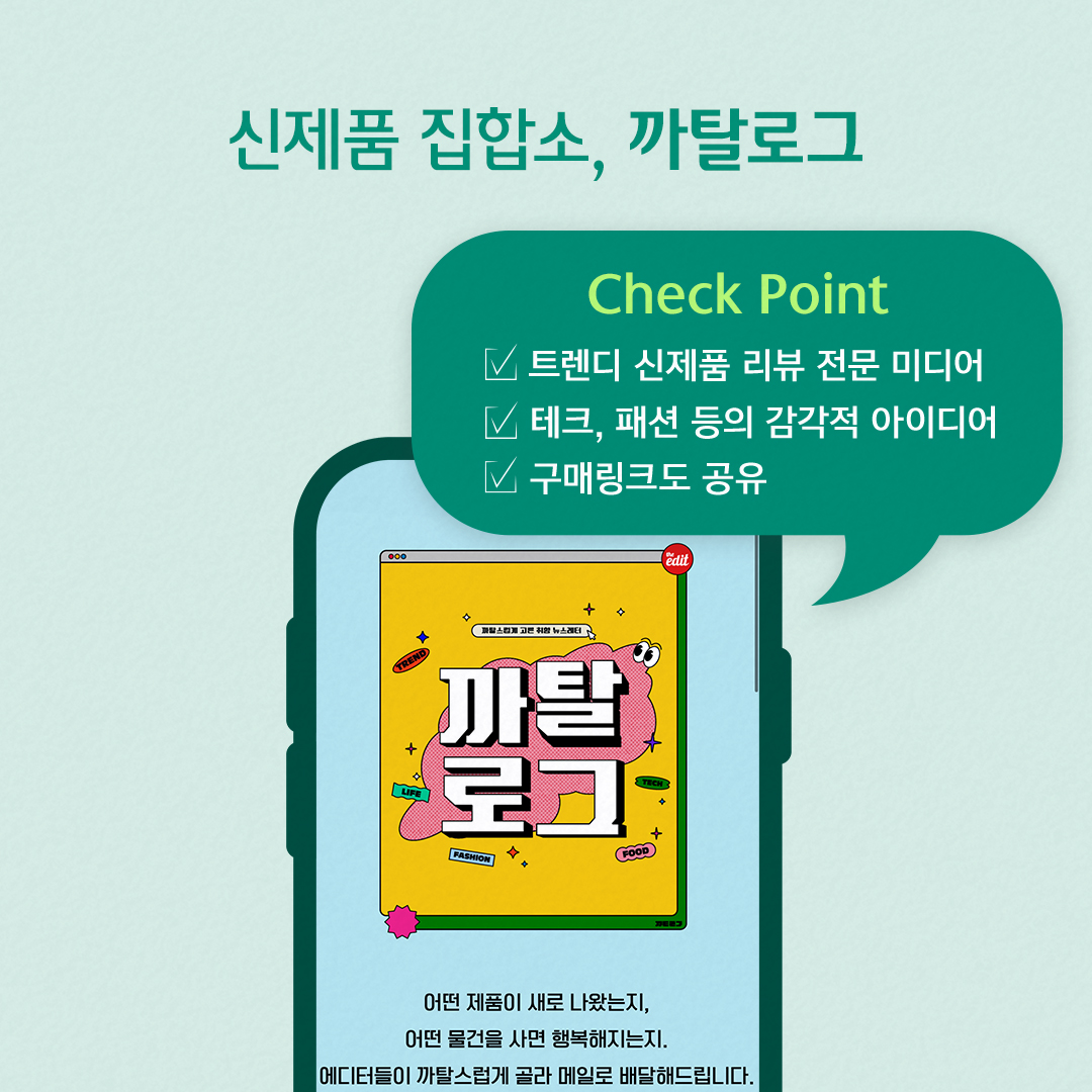 까탈로그는 제품 리뷰 전문 채널 ‘디에디트’가 까다롭게 고른 취향 가득한 아이템들을 소개하는 뉴스레터입니다. 구독을 하면 테크, 패션, 공연, 다큐 등 트렌디하면서도 감각적인 아이디어를 공유 받을 수 있어요. ‘절대 잊지 못할 집들이 선물’이나 ‘우리 엄마의 최애 간식’ ‘쓸데없는 아이디어만 모았어’처럼 트렌디한 콘셉트와 감각적인 비주얼, 눈에 꽂히는 타이틀과 쉽고 짧은 내용이 밀레니얼의 취향을 저격합니다. 또 해당 제품의 구매 링크까지 함께 소개해줘 구매 방법을 검색하는 번거로움 없이 바로 쇼핑으로 연결됩니다.
