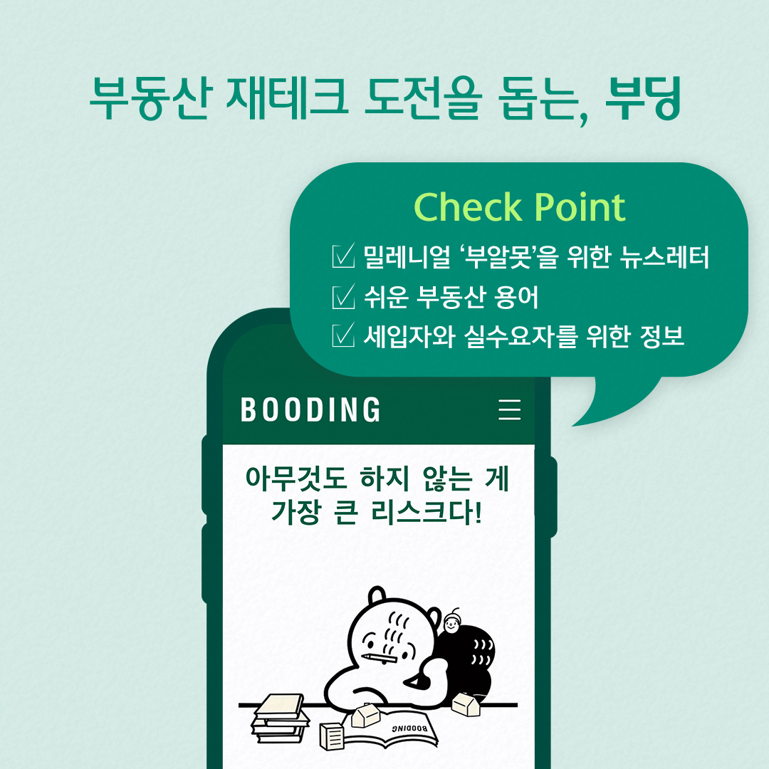 ‘아무것도 하지 않는 게 가장 큰 리스크다’라는 슬로건으로 시작되는 부딩은 부동산 재테크에 도전 한번 못한 밀레니얼 부알못(부동산 알지 못함)을 위한 부동산 뉴스레터입니다. 초딩, 고딩, 직딩에서 가져온 부딩은 최신 부동산 이슈와 지역별 시장 상황 등 보기 쉽고 직관적인 디자인으로 부알못도 쉽게 이해가 가능하고 어렵지 않게 부동산 경제에 진입할 수 있어요. 부동산 핵심 지역 소식과 급매 정보, 쉽게 풀이한 부동산 용어 사전 등 당장의 세입자와 실수요자를 위한 알찬 정보들이 제공됩니다. 무료 콘텐츠 외에, 내 집 마련 컨설팅과 정기 칼럼, 1인 가구 에세이 등 프리미엄 유료 콘텐츠도 꽤 알차고 유익해요.