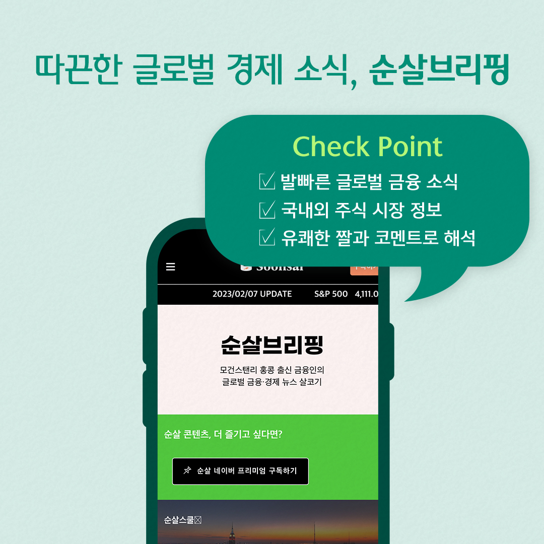 순살브리핑은 모건스탠리 홍콩 출신의 에디터들이 미국, 중국, 홍콩 등 실시간 글로벌 금융 소식과 경제 이슈를 다음날 아침에 따끈따끈한 메일로 전달해 줘요. 순살브리핑 이메일 뉴스레터와 함께 순살 비디오, 순살 카드 뉴스를 각각 유튜브와 인스타그램을 통해 무료 콘텐츠로 접할 수 있고, 국내외 주식 시장과 환율, 글로벌 기업 동향, 각종 경영 실적 등을 간결하게 정리해 줘서 평소 경제 상식을 쌓는 데에도 큰 도움이 됩니다. 자칫 무겁고 진지한 금융 뉴스를 유쾌한 짤과 코멘트를 섞어 어려운 콘텐츠를 순살 발라 먹듯 일목요연하게 제공해 주기 때문에, 갓생살기 Z세대도 충분히 이해할 수 있습니다.