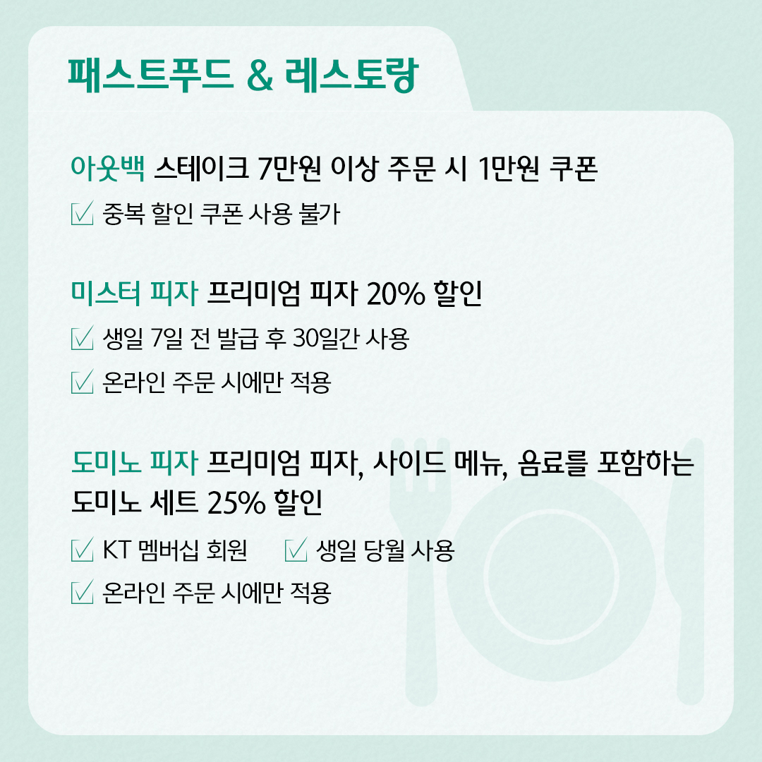 7) 도미노 피자 : 프리미엄 피자, 사이드 메뉴, 음료를 포함하는 도미노 세트 25% 할인(온라인 주문 시)/ KT 멤버십 회원/ 생일 당월 사용