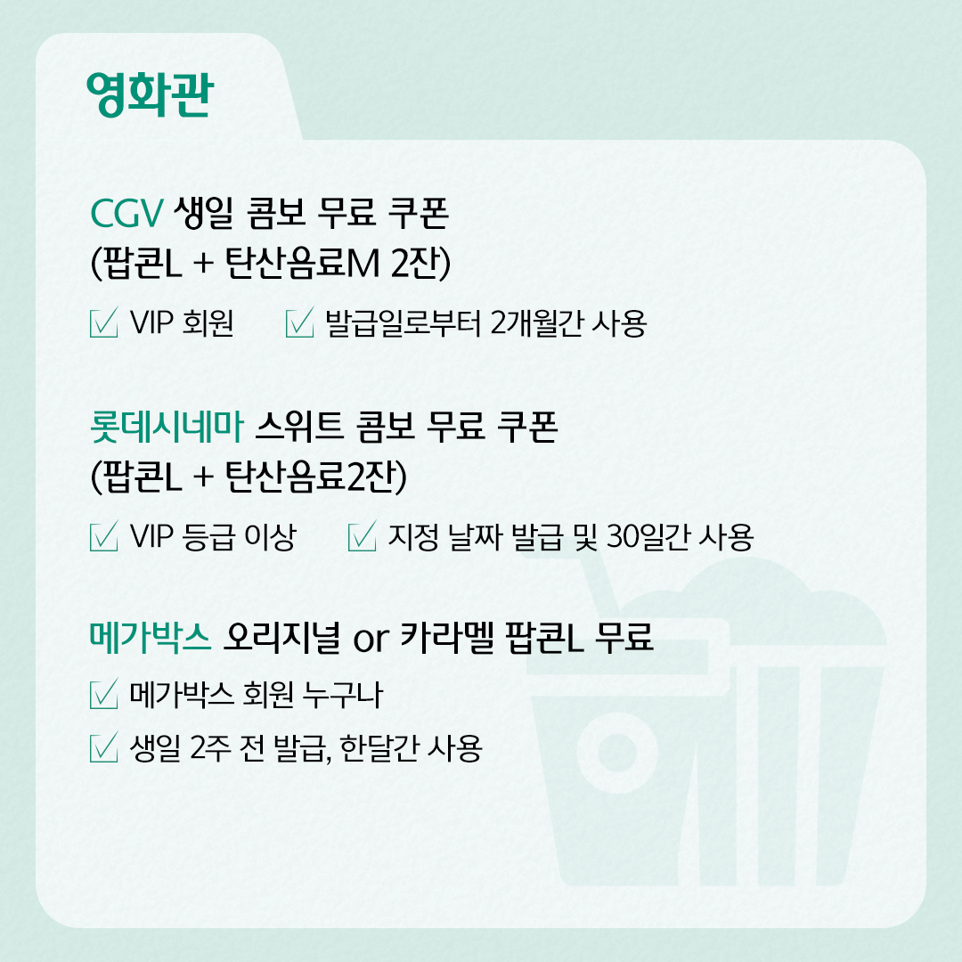 1) CGV : 생일 콤보 무료 쿠폰(팝콘L + 탄산음료M 2잔)/ VIP 회원/ 발급일로부터 2개월간 사용