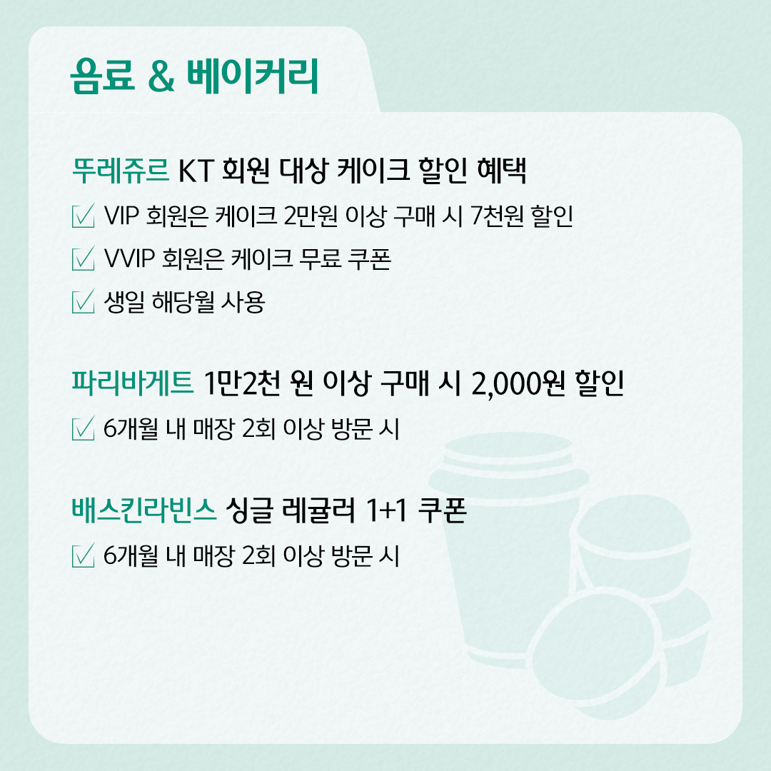 5) 뚜레주르 : KT 회원 대상 케이크 할인 혜택/ VIP 회원은 케이크 2만 원 이상 구매 시 7천 원 할인, VVIP 회원은 케이크 무료 쿠폰/ 생일 해당하는 달에 사용