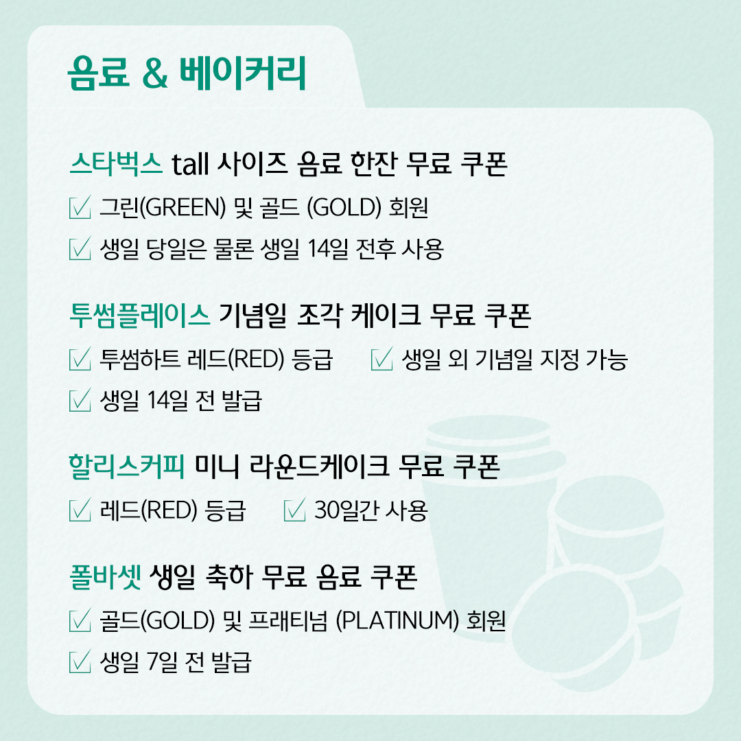 4) 폴바셋 : 생일 축하 무료 음료 쿠폰/ 골드(GOLD) 및 프래티넘(PLATINUM) 회원/ 생일 7일 전 발급