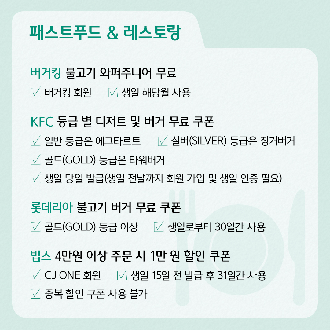 4) 빕스 : 4만 원 이상 주문 시 1만 원 할인 쿠폰/ CJ ONE 회원/ 생일 15일 전 발급 후 31일간 사용/ 중복 할인 쿠폰 사용 불가