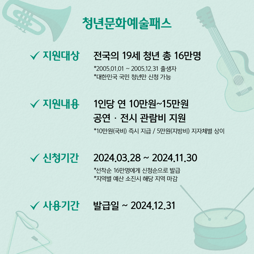 문화체육관광부가 올해 처음 실시하는 청년문화예술패스는 2005년에 출생한 국내 거주 19세 청년을 대상으로 1인당 최대 15만 원의 문화예술 관람비를 지원합니다. 사회에 첫발을 내딛게 되는 전국의 19세 청년 16만 명에게 지원되는 청년문화예술패스는 그간 학업으로 자유롭게 문화예술을 즐기지 못한 청년들을 위해 마련되었습니다. 특히 청년들이 원하는 문화예술을 마음껏 즐기고 예술 창작 활동에 대한 간접적 지원과 문화예술 시장 활성화를 목적으로 시행됩니다.
