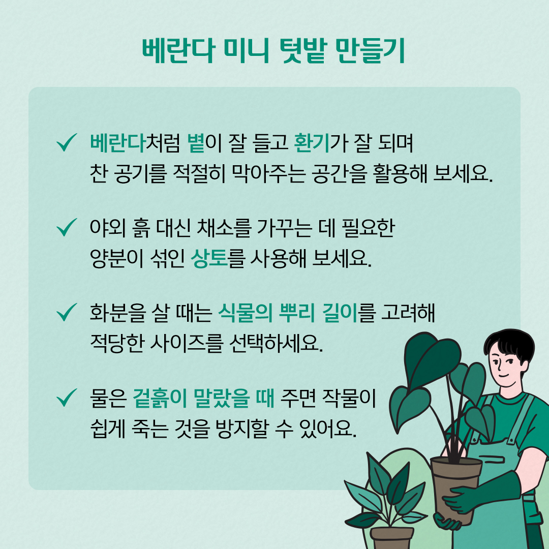 베란다를 미니 텃밭으로 가꿔 작물을 길러볼 수 있습니다. 비록 작은 공간일지라도 베란다는 볕이 잘 들고, 창을 이용해 환기나 외부 찬 공기를 적절히 막아줄 수 있기 때문에 1년 내내 작물이 자라는 공간으론 안성맞춤입니다. 텃밭을 만들기 위한 준비물은 흙과 화분입니다. 흙은 이물질이나 벌레가 있을 수 있는 야외 흙을 사용하지 말고 채소를 가꾸는 데 필요한 양분이 섞인 채소용 상토를 구입합니다. 화분은 채소의 뿌리 길이를 고려해 맞는 사이즈로 구입해야 하는데, 상추처럼 뿌리가 적은 작물은 15cm 깊이가 적당하고 뿌리가 많은 방울토마토나 딸기는 20cm 깊이 정도를 준비해 주면 됩니다.