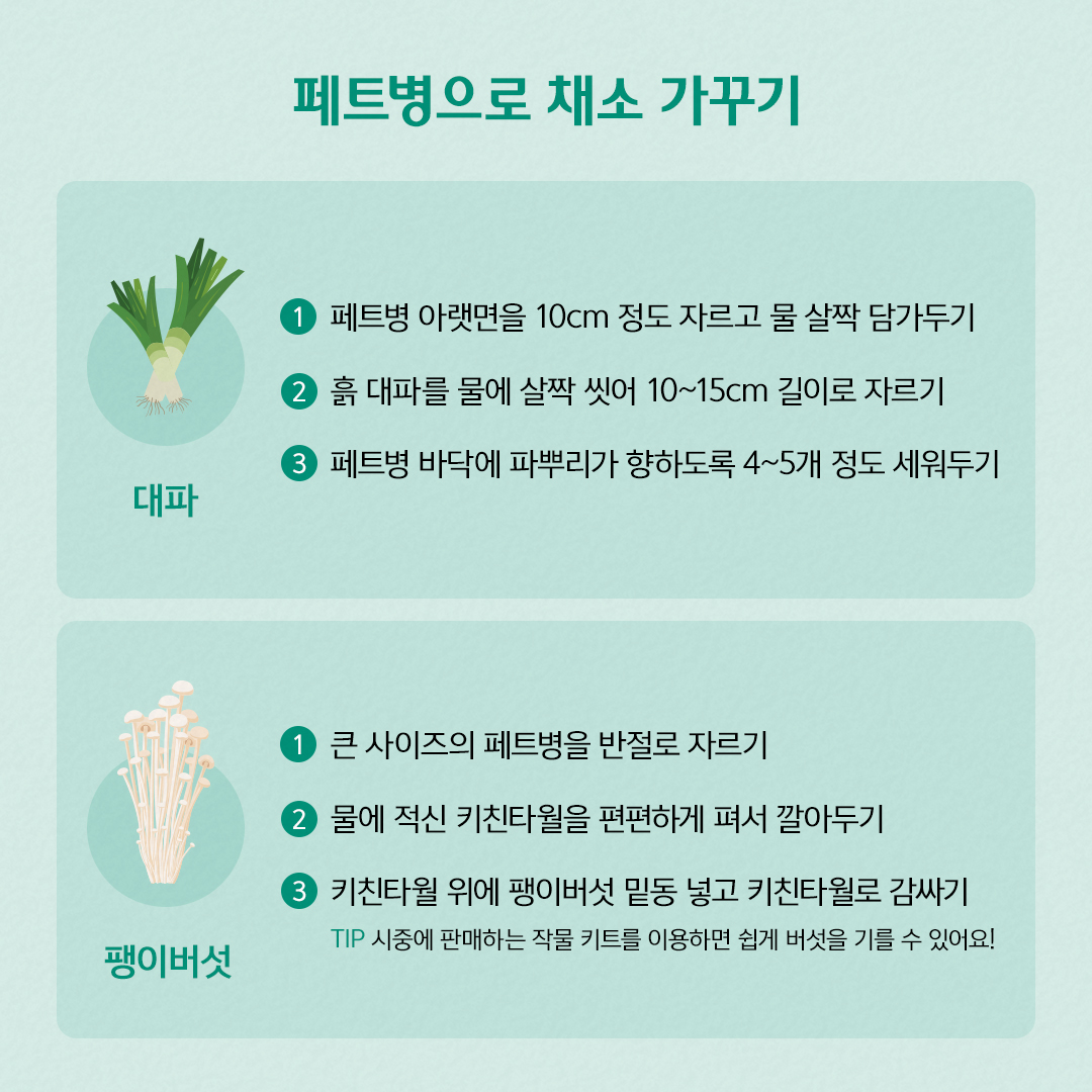 파는 흙에 심거나 물에 둬도 잘 자라는 작물입니다. 페트병 아랫면을 10cm 길이 정도로 잘라주고 물을 살짝 담가 둡니다. 흙 대파는 물에 살짝 씻어준 뒤 10~15cm 정도 길이로 자르고 페트병 바닥 면에 파 뿌리가 향하도록 4~5개 정도를 넣어 세워 둡니다. 시간이 지나며 물을 계속 보충해 주면 파가 금세 자라는 것을 볼 수 있습니다.