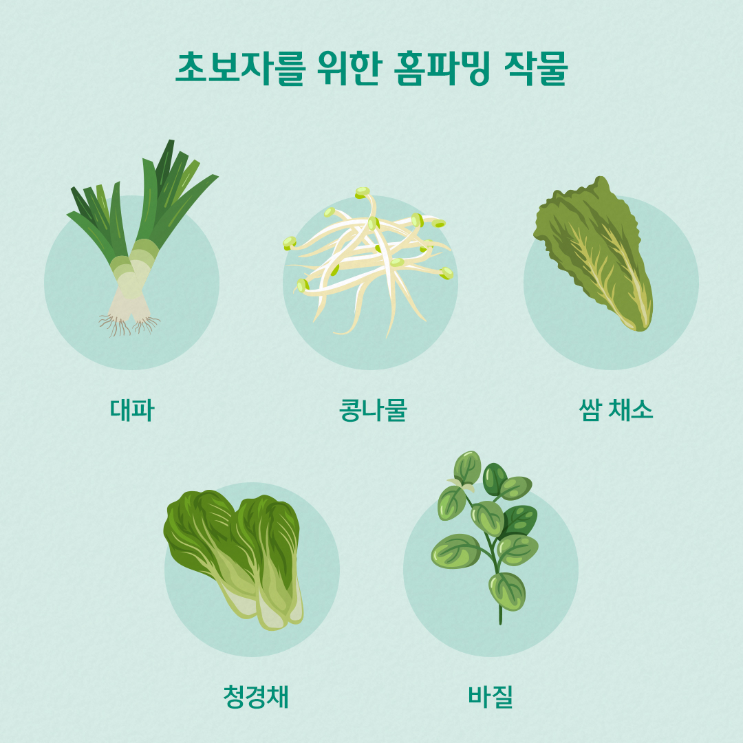 홈파머가 되려고 해도 초보자라면 쉽게 도전하기 어려운 법인데요. 초보자도 쉽게 기를 수 있는 관리하기 쉬운 작물들을 추천합니다. 흙에서도 물에서도 잘 자라는 파 혹은 빛을 차단해 주고 하루 한 번 물을 주면 잘 자라는 콩나물은 초보자라도 쉽게 길러 볼 만한 난이도 낮은 작물입니다. 또 상추나 쌈 채소, 청경채, 바질은 베란다 볕 잘 드는 곳에 화분에 모종을 심은 뒤 겉흙이 말랐을 때마다 물 주는 것을 잊지 않도록 관리해 주면 빠르게 성장하는 작물들로, 초보자도 쉽게 채소 기르기에 도전할 수 있습니다.