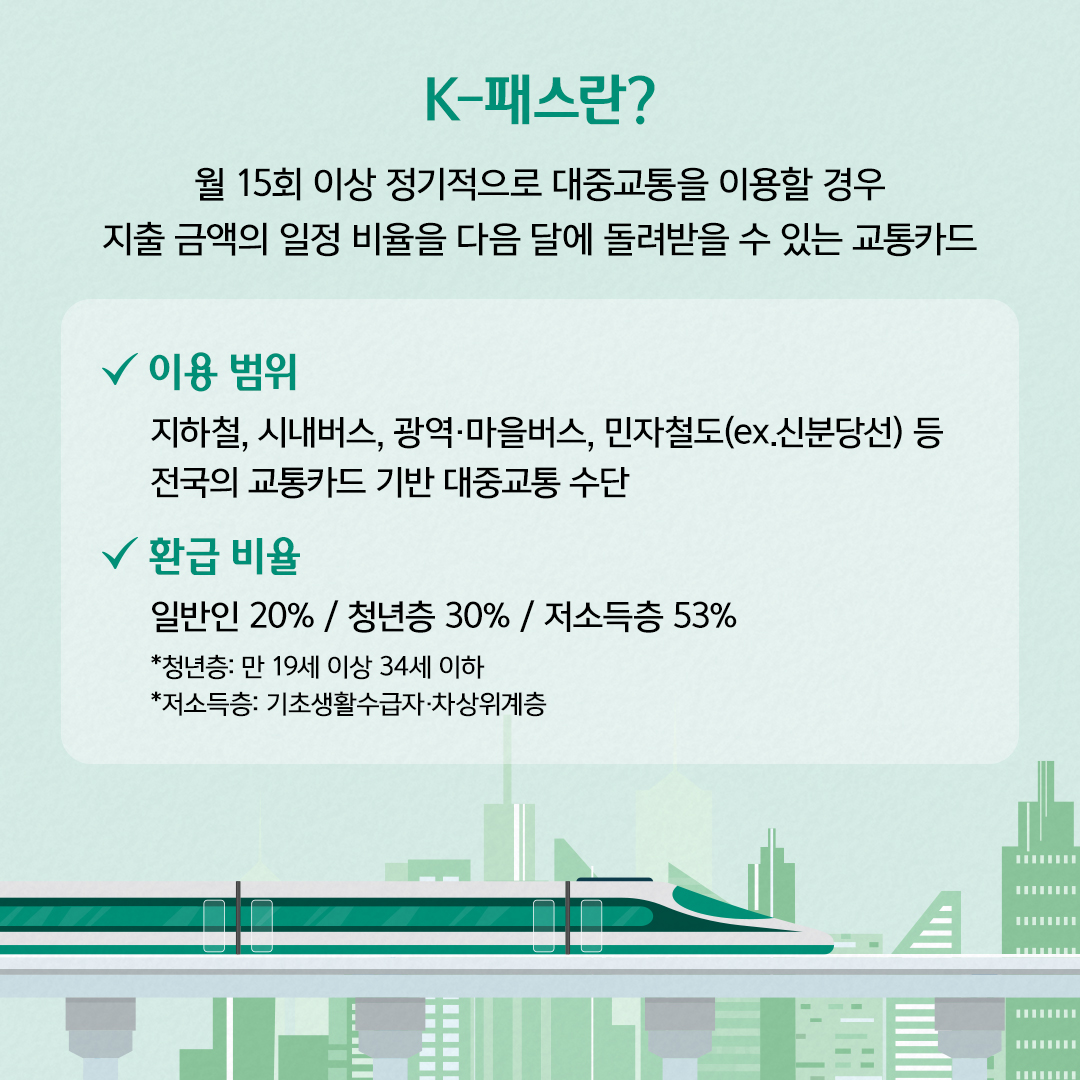 K-패스란, 대중교통을 월 15회 이상 이용하면 지출 금액의 일정 비율만큼 다음 달에 돌려받을 수 있는 교통카드입니다. 즉 매월 일정 횟수 이상을 사용한 교통비 일부를 적립해 다음 달에 돌려받는 구조인 셈이죠. 지하철, 시내버스, 마을버스, 광역버스, GTX를 포함한 전국의 교통 카드 기반 대중교통 수단이 해당하며, 월 15회 이상 이용 시 최대 60회까지 사용한 교통비를 환급받을 수 있습니다. 단, K-패스 가입 첫 달에는 월 15회 미만 이용 시에도 지급됩니다.