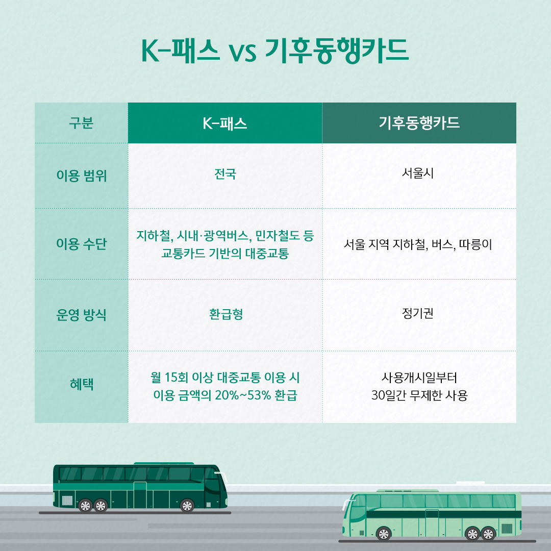 그렇다면 기후동행카드와 비교해 봤을 때 차이점이 무엇일까요? 기후동행카드는 6만 5천 원에 서울 지하철, 버스, 따릉이를 무제한 이용할 수 있는 반면, K-패스는 이동 거리 관계없이 지출한 교통비의 일정 비율이 적립 및 환급된다는 차이가 있습니다. 또한 기후동행카드는 서울시에서만 사용 가능하나, K-패스는 특정 지역이 아닌 전국에서 이용 가능합니다.