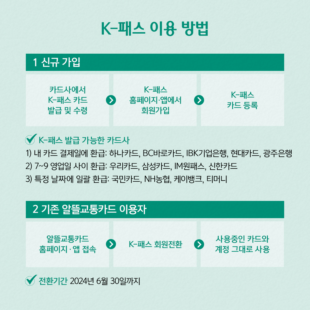 K-패스를 이용하기 위해서는 먼저 카드사를 통해 K-패스 카드를 발급받은 후, K-패스 홈페이지나 앱에서 회원 가입 절차를 거쳐야 합니다. 회원 가입 후 발급받은 K-패스 카드로 전국 대중교통 이용 시 이용 금액의 일정 비율이 적립됩니다.
