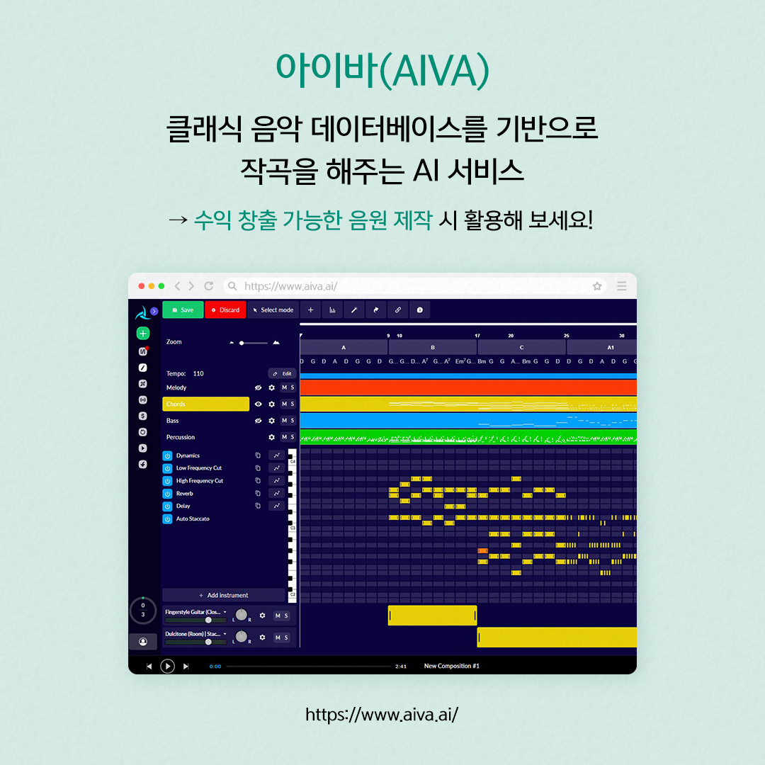 저작권 때문에 유튜브나 인스타 피드 수익 창출이 어려웠던 적이 있으신가요? 그렇다면 아이바(AIVA)로 내 취향에 맞는 곡을 직접 만들어 보세요. 아이바는 클래식 음악 데이터베이스를 기반으로 새로운 음악을 작곡해 주는 인공지능입니다. 아이바에서 새로운 트랙 만들기를 시작한 후 원하는 음악 장르를 선택하면 여러 개의 샘플 트랙이 생성됩니다. 메인 코드, 트랙 길이, 음높이 등을 직접 설정해 주면 원하는 곡이 완성되고, 오픈 에디터를 통해 템포나 멜로디 수정도 가능합니다. 아이바 무료 버전으로 만든 음악은 수익 창출이 불가능하지만, 유료 서비스 구독 시 상업적으로 이용이 가능하여 개인의 수익 창출이 가능한 곡을 만들 수 있습니다.