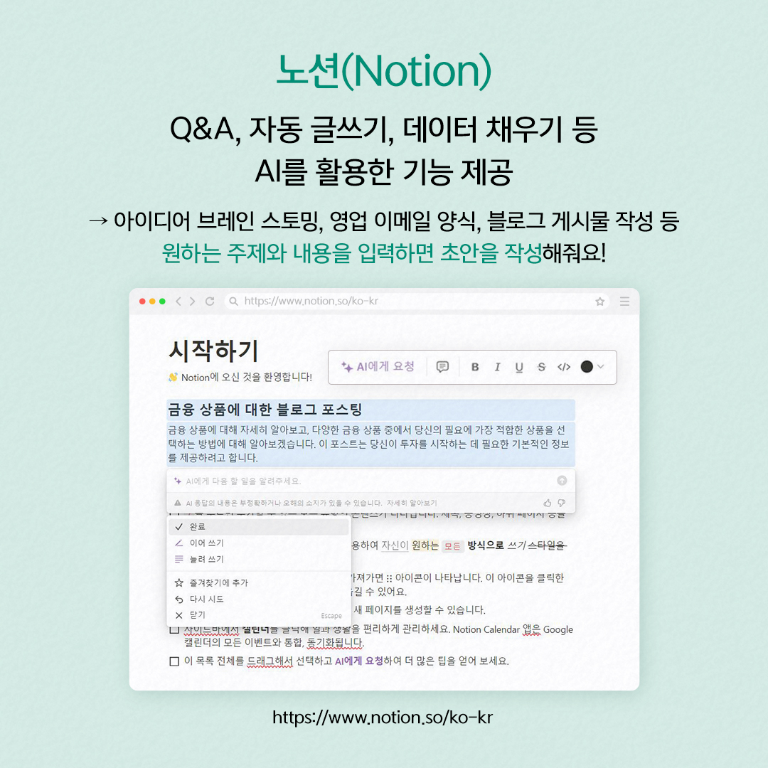 문서 작업을 쉽게 하고 싶으신가요? 그렇다면 노션(Notion) AI 기능을 추천합니다. 노션은 Q&A, 자동 글쓰기, 데이터 채우기 등의 AI 기능을 제공합니다. 노션이 제공하는 AI 요약 기능을 활용해 이미 작성한 보고서나 글의 핵심만 요약할 수 있어 회의록을 요약할 때 유용합니다. 노션 AI는 크리에이티브가 필요할 때 브레인스토밍으로 창의적인 아이디어를 제공하기도 하고, 문서 전반의 정보를 기반으로 내가 해야 할 일을 관리해 주어 효율적으로 스케줄을 관리하는 데 도움을 줍니다. 노션 AI는 직접 글을 써주기도 하는데요, 글의 분량은 물론 문장의 어조와 톤까지도 수정할 수 있어 자연스러운 문장 구사가 가능합니다. 드래그만으로 번역, 요약, 인사이트 작성 등의 기능을 사용할 수 있어 업무 시간을 대폭 단축해 주는 노션은 직장인들에게 가장 사랑받는 툴 중 하나입니다.