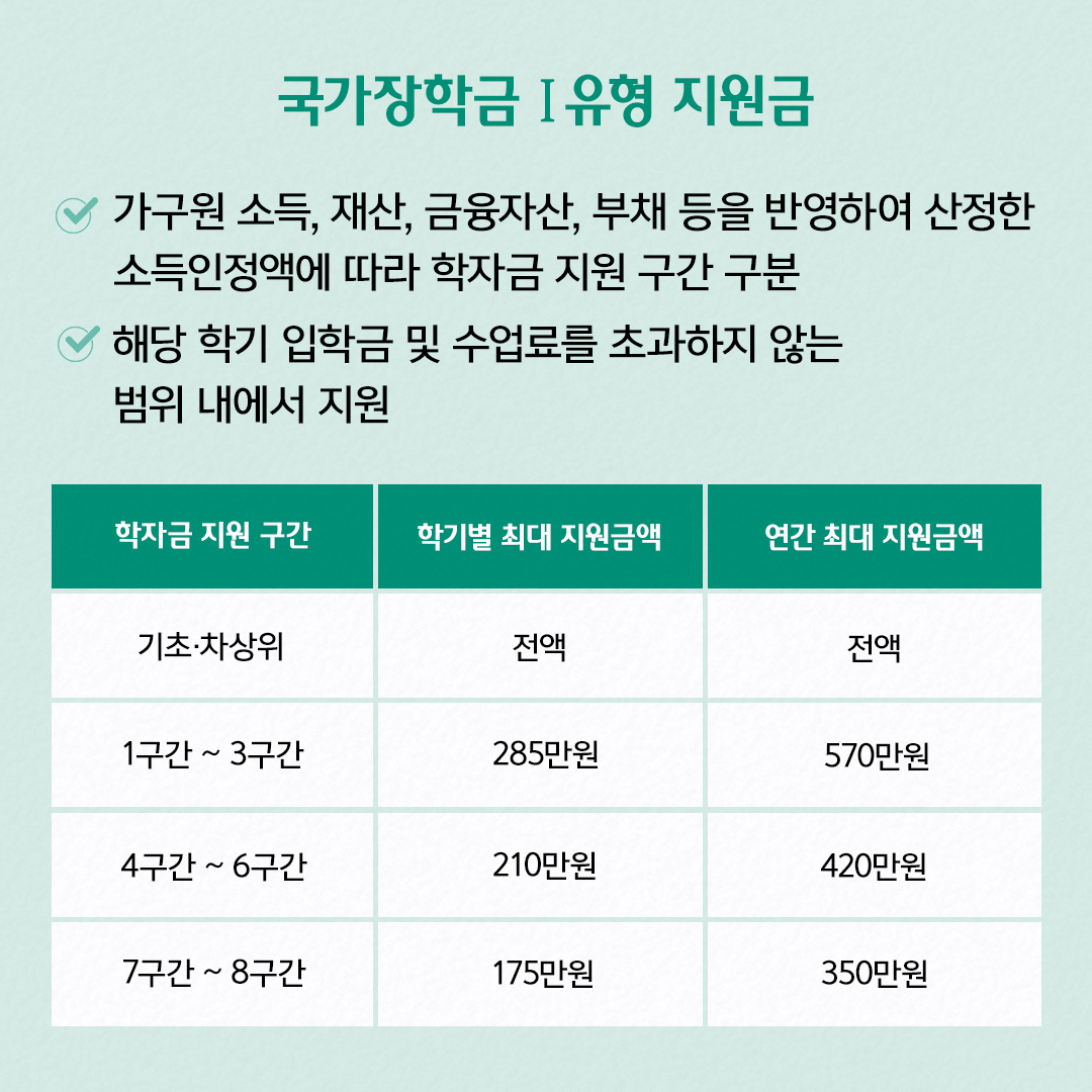 2024학년도부터 기초・차상위 계층의 자녀에게는 등록금 전액이 지원됩니다. 그 외에는 가구원 소득, 재산, 금융자산, 부채 등을 반영하여 산정한 소득인정액에 따라 지원 구간을 나누고, 구간별로 최대 지원 금액이 달라집니다. 1구간에서 3구간까지는 연간 최대 570만 원, 4구간에서 6구간은 420만 원, 7~8구간은 350만 원입니다.