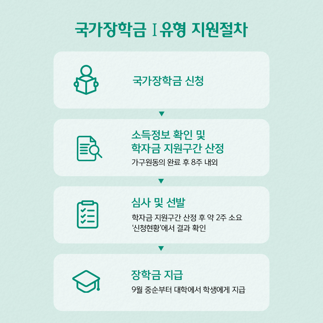 국가장학금 신청 및 가구원 동의까지 완료되면 학자금 지원 구간 산정을 위해 소득정보 확인이 이루어집니다. 학자금 지원 구간이 산정되면 한국장학재단과 대학에서 약 2주간 신청자 정보 확인 및 심사를 진행합니다. 심사가 종료되고 최종 수혜자가 확정되면 9월 중순부터 대학별로 장학금 지급이 시행됩니다.