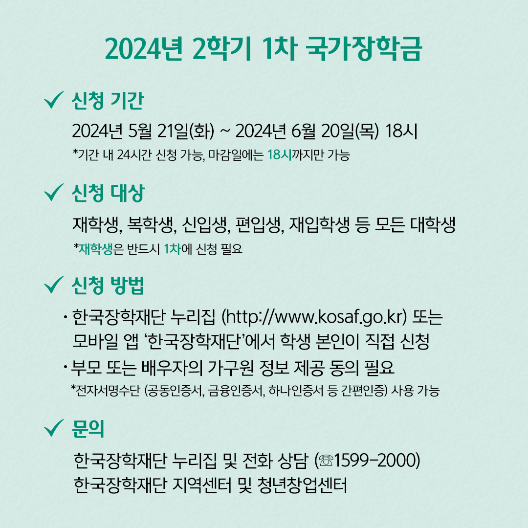 국가장학금은 한국장학재단 누리집 또는 모바일 앱을 통해 반드시 학생 본인이 직접 신청해야 합니다. 신청 기간에는 24시간 신청이 가능하지만 마지막 날인 6월 20일은 18시까지만 신청 가능하니 꼭 마감 시간 전에 접수하시기를 바랍니다.