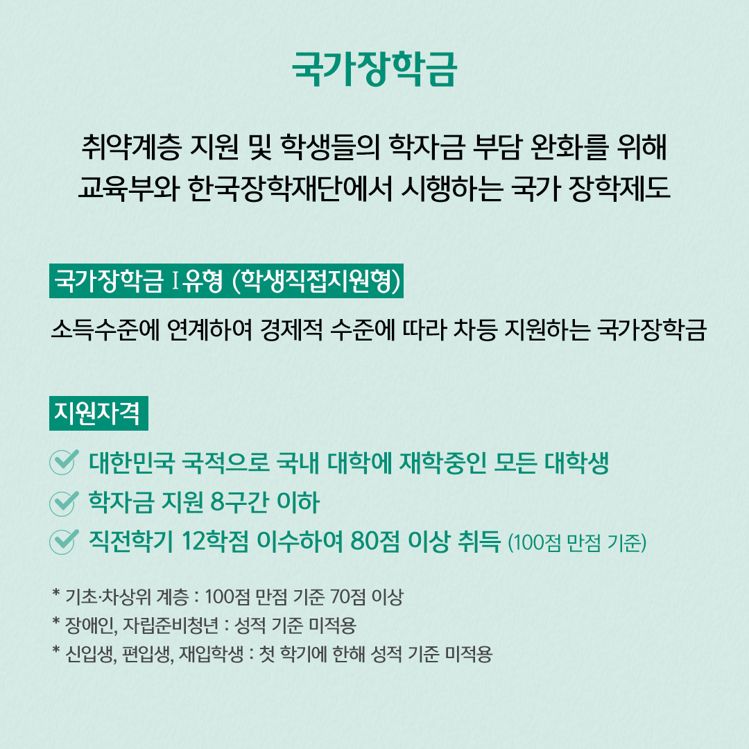 국가장학금은 크게 두 가지 유형으로 구분해 지원합니다. 첫 번째 I 유형은 학생직접지원형이고 두 번째 II 유형은 대학연계지원형입니다. 이 중에서 국가장학금 I 유형(학생직접지원형)은 대한민국 국민으로 국내 대학에 재학 중인 학자금 지원 8구간 이하 대학생 중에서도 성적 기준을 충족하면 지원 구간에 따라 차등 지원합니다.