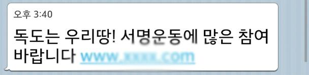 우리나라 사람들은 특히 애국심이 강합니다. 불행히도 이 점이 범죄자들에게 악용되고 있는데요. 독도 지키기 등의 서명 운동 형식의 스미싱 문자를 통해 클릭을 유도하는 것입니다.