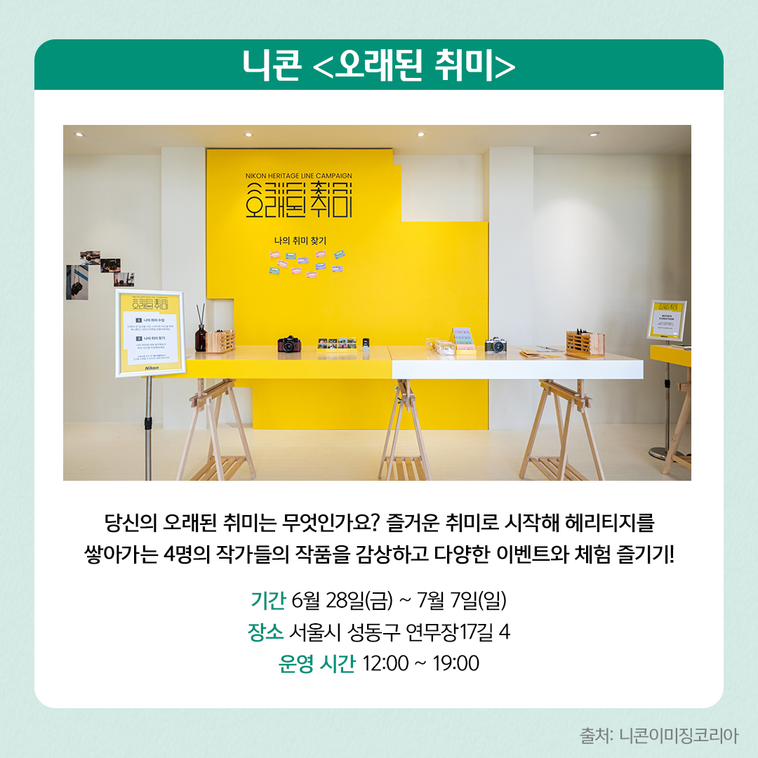 “당신의 오래된 취미는 무엇인가요?”라는 메시지를 주제로 한 니콘의 <오래된 취미> 팝업 전시가 7월까지 이어집니다. 이번 전시에서는 취미로 사진을 시작해 자신만의 헤리티지를 쌓아가는 4명의 사진작가 ‘황선하’, ‘Simpson Kim’, ‘김규형’, ‘박현성’의 작품을 감상할 수 있습니다. 도슨트 투어, 작가와의 미니 토크 등 다양한 이벤트도 즐길 수 있어요. 또 니콘 카메라의 철학과 헤리티지 제품들을 관람할 수 있고, 방문객들이 티켓의 빈 공간을 사진 스티커로 직접 커스터마이징 할 수 있는 공간도 마련되어 있습니다. 나만의 취미를 찾아보는 시간 등 의미 있는 프로그램 체험도 경험해 볼 수 있습니다.