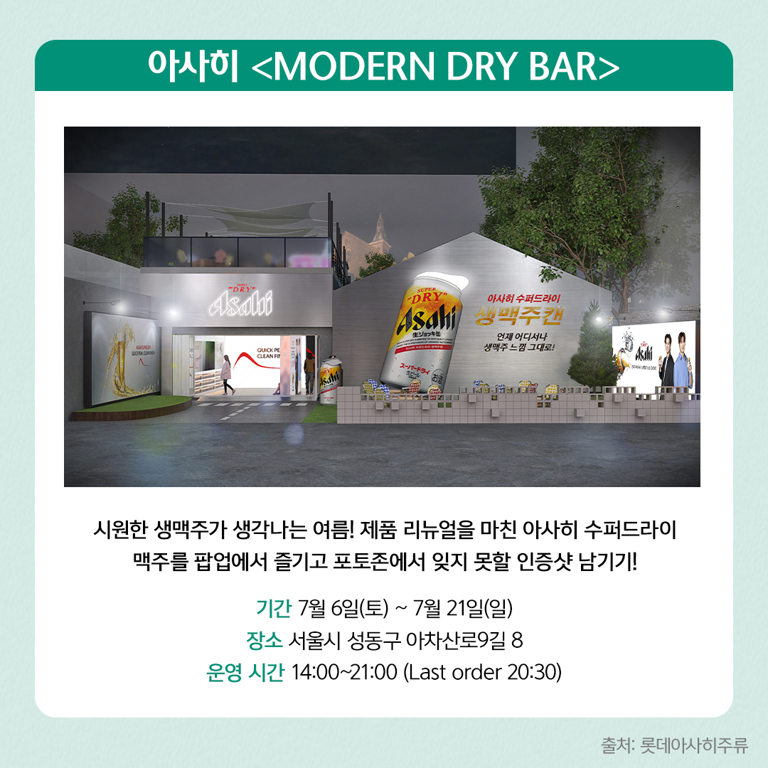시원한 생맥주가 생각나는 여름을 맞아 아사히 생맥주캔 팝업스토어가 찾아옵니다. 생맥주의 시원함을 그대로 담은 아사히 수퍼드라이를 시음할 수 있는 이번 팝업은 맥주를 즐기는 바(bar)와 루프탑에서 즐기는 피크닉 두 가지 콘셉트로 운영됩니다. 풍부한 거품과 부드러운 맛으로 사랑받아 온 아사히 수퍼드라이 캔맥주를 팝업에서 즐기고 포토존에서 잊지 못할 인증샷도 남겨 보세요.