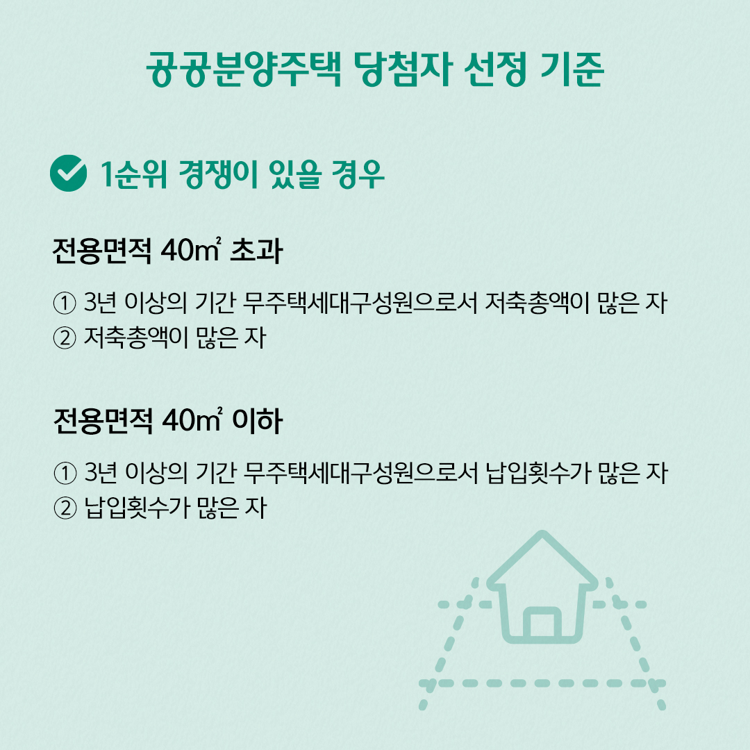 1) 전용면적 40 ㎡ 초과: 3년 이상 무주택세대구성원으로서 저축총액이 많은 경우