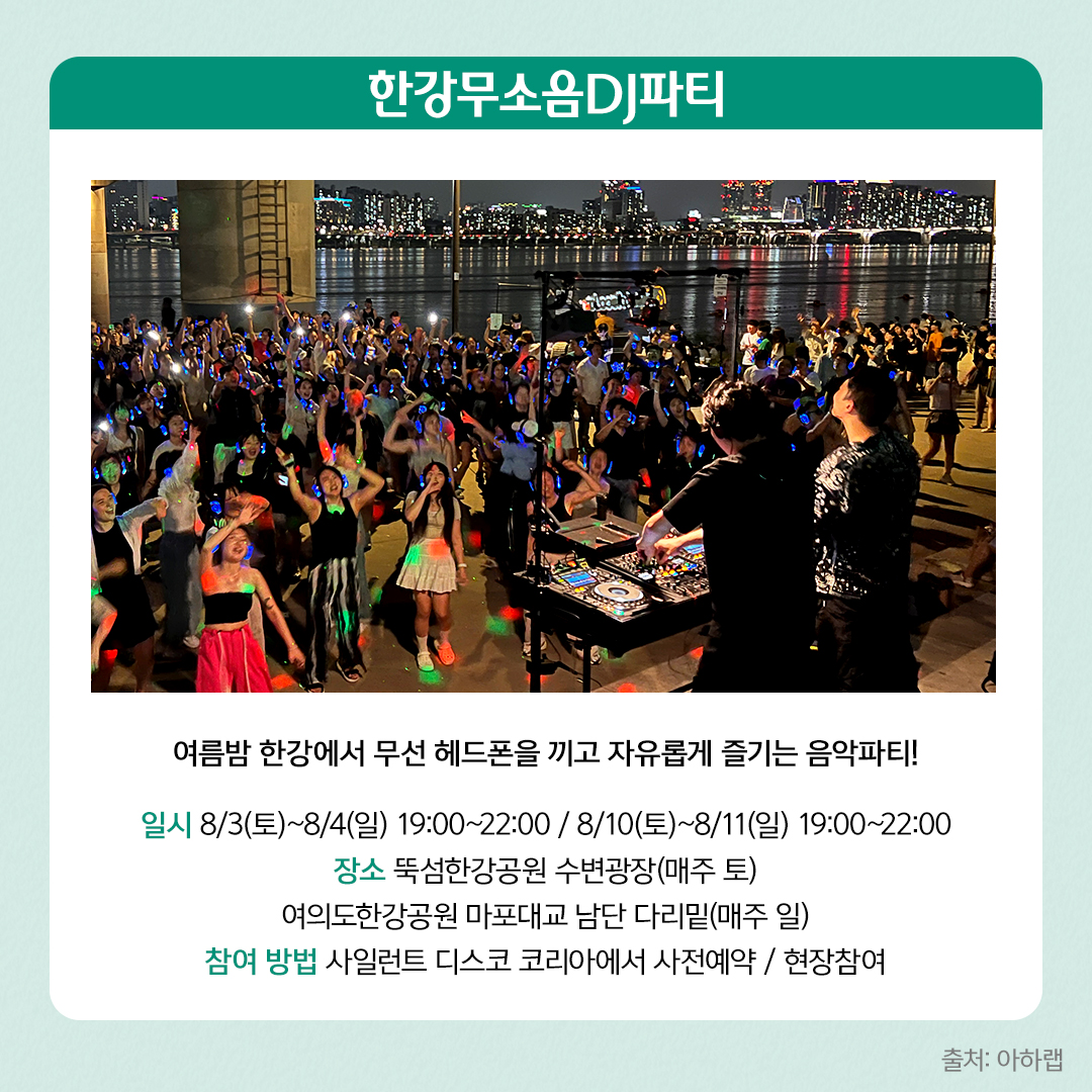 트렌디하고 감각적인 한강무소음DJ파티에 참여해 보세요. 여름밤 한강에서 즐기는 무소음DJ파티는 무선 헤드폰을 이용해 DJ가 선사하는 플레이리스트에 맞춰 자유롭게 즐기는 음악 파티입니다. 남녀노소 누구나 국적과 관계없이 즐기는 무소음DJ파티는 EDM에서 K-POP까지 다채로운 선곡으로 흥겨움을 선사합니다.