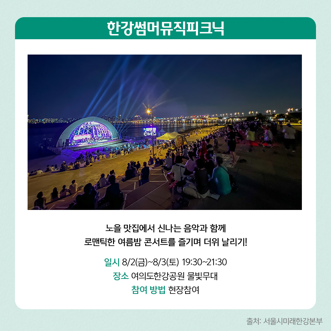 시원한 한강을 배경으로 로맨틱한 여름밤 음악 콘서트를 즐겨 보세요. 첫째 날은 환상적인 멜로디로 관객을 사로잡는 ‘하모나이즈 앙상블’의 여름밤에 떠나는 바캉스로, 둘째 날은 만능 소리꾼 ‘이봉근’과 한산 밴드의 국악 크로스오버 콘서트가 개최됩니다.