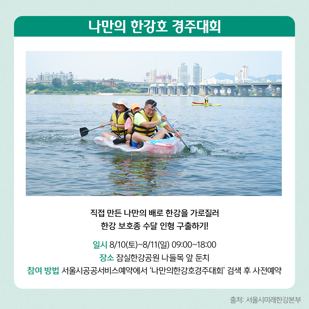 온 가족이 힘을 합쳐 재활용품으로 만든 배를 타고 한강을 가로질러 한강 보호종인 수달 인형을 구출하는 탐험에 도전해 보세요. 캔과 우유갑, 페트병 등 재활용 소재를 사용해 독창적인 한강호를 만든 뒤, 직접 한강을 가로질러 반환점을 돌아오는 수상 경주대회입니다. 반환점 부표 위 수달 인형을 가장 먼저 구조한 팀에게는 우승 상품도 수여됩니다.