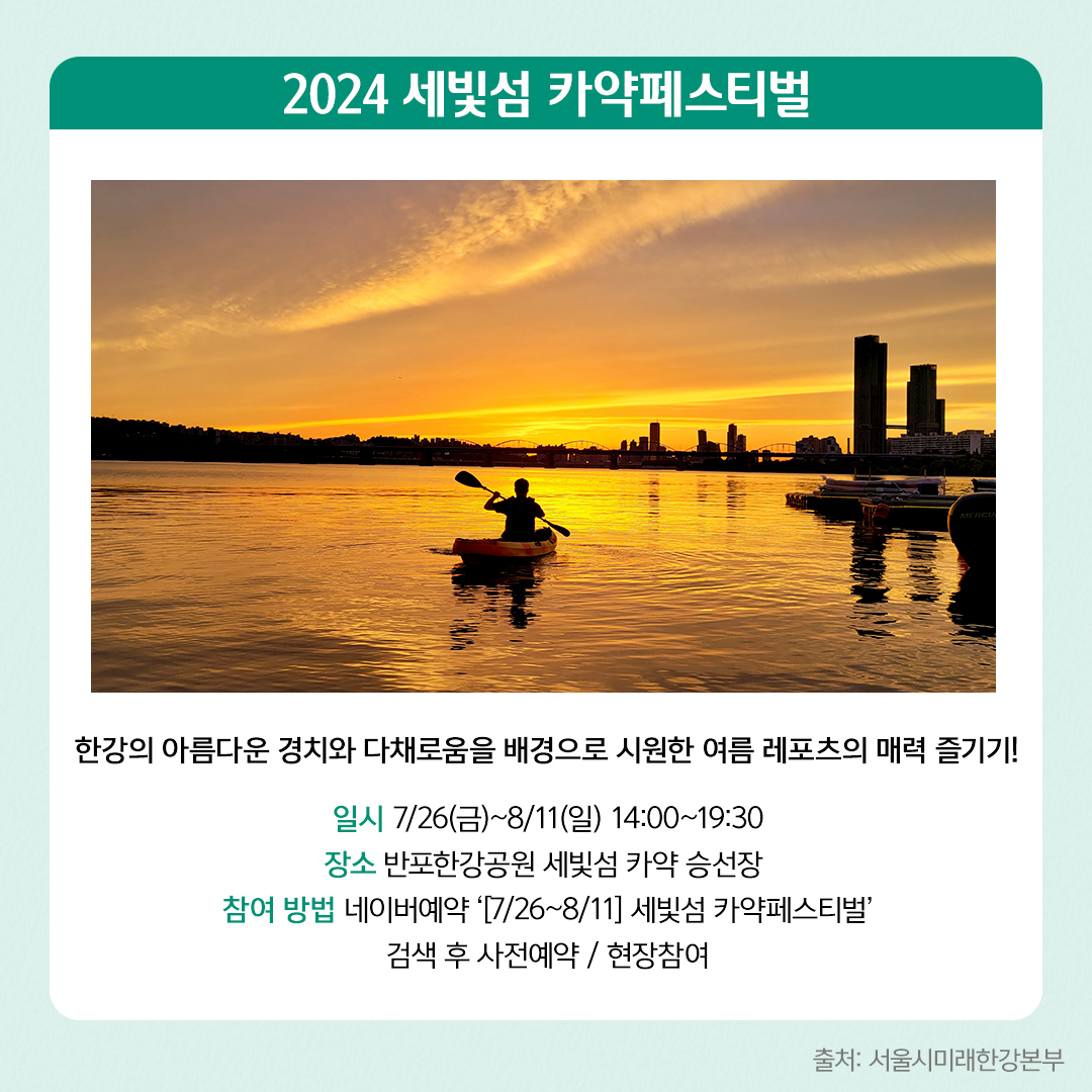 참여방법: 네이버예약에서 ‘[7/26~8/11] 세빛섬 카약페스티벌’ 검색 후 사전예약 / 현장참여