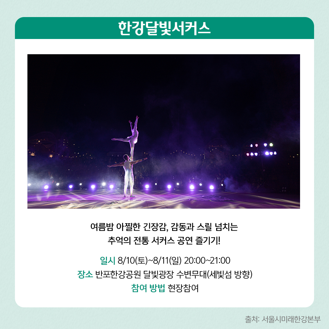 손에 땀을 쥐게 하는 아찔한 긴장감과 인간의 한계를 넘어서는 추억의 전통 서커스를 여름밤 가족들과 함께 즐겨보세요. 국내 유일의 서커스단 동춘 서커스 소속 곡예사들이 선보이는 공중 아크로바트, 서커스 발레, 쌍절곤 묘기 등 14가지의 화려한 서커스 무대가 감동과 스릴을 선사합니다.
